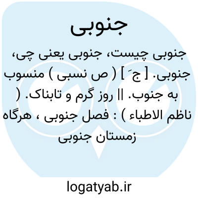 جنوبی. [ ج َ ] ( ص نسبی ) منسوب به جنوب. || روز گرم و تابناک. ( ناظم الاطباء ): فصل جنوبی، هرگاه زمستان جنوبی باشد یعنی گرم و بارنده و از پس او بهار شمالی باشد یعنی سرد و خشک بیشتر زنان آبستن را بچه بیفتد. ( ذخیره خوارزمشاهی ).