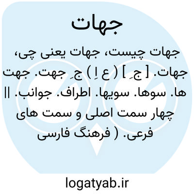 ( اسم ) جمع جهت. ۱- سویها سوها اطراف جوانب.۲- هر یک از چهار سمت اصلی و سمتهای فرعی.۳- رویها همه روی بهمه جهات.۴- مالیاتی است که بر صنایع تعلق میگرفته. یا جهات اربعه ( چهارگانه ). یا جهات اصلی ( اصلیه ). شمال جنوب مشرق و مغرب. یا جهات فرعی ( فرعیه ). شمال شرقی شمال غربی جنوب شرقی جنوب غربی. یامال وجهات. مالیاتی که بمصرف تامین خوار بار کاروان حج میرسید مال الجهاه.