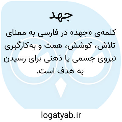کلمه‌ی «جهد» در فارسی به معنای تلاش، کوشش، همت و به‌کارگیری نیروی جسمی یا ذهنی برای رسیدن به هدف است. این واژه بار معنایی مثبت دارد و معمولاً برای توصیف اعمال و فعالیت‌هایی به کار می‌رود که نیازمند انرژی، پشتکار و کوشش مستمر هستند. جهد می‌تواند در زمینه‌های مختلف مانند علمی، فنی، عملی، اخلاقی و عبادی به کار رود و بیانگر عزم و اراده فرد برای انجام کارهای مهم و ارزشمند است.