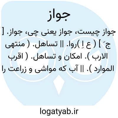 جواز. [ ج َ ] ( ع اِ )روا. || تساهل. ( منتهی الارب ). امکان و تساهل. ( اقرب الموارد ). || آب که مواشی و زراعت را دهند. ( منتهی الارب ). آبی که داده شده است بمال از چارپایان. ( برهان ). || چک مسافران که از سلطان گیرند تا کسی در راه متعرض نشود. ( منتهی الارب ) ( اقرب الموارد ). گذرنامه. ( حاشیه فرهنگ اسدی نخجوانی ) ( مهذب الاسماء ). کارنامه. || پروانه. پاسپورت. ( فرهنگ فارسی معین ). تذکره و آن در زمان مأمون الرشید در خراسان معمول گردید. ( کامل ابن اثیر ج 6 ص 93 ). || خط و دستک راه. ( برهان ).