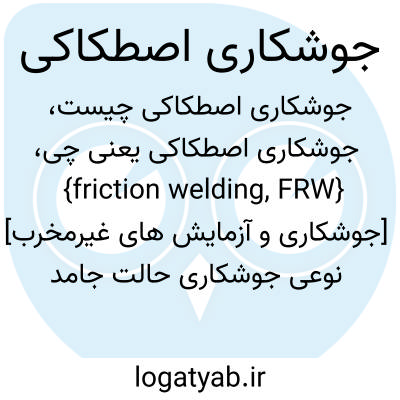 {friction welding, FRW} [جوشکاری و آزمایش های غیرمخرب] نوعی جوشکاری حالت جامد که در آن نیروی فشاری بین قطعه کار درحال چرخش یا حرکت نسبی آنها موجب تولید گرما و جابه جایی مومسانی مواد در سطح تماس می شود و از این طریق قطعات به هم اتصال می یابند