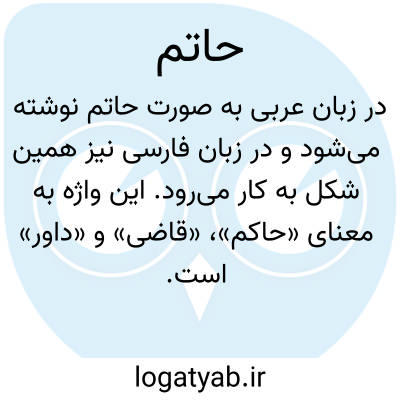معنی: حاکم، قاضی، داور، نام مردی بسیار سخاوتمند از قبیله طی، به معنی حاکم، ( اَعلام ) رییس قبیله و شاعر عرب [قرن میلادی] که به بخشش و دلاوری معروف بود و داستانهای فراوانی درباره ی او و خانواده اش به عربی و فارسی نوشته شده است، ( در اعلام ) نام مردی عرب بود که به بخشندگی شهرت داشت