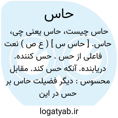 حاس. [ حاس س ] ( ع ص ) نعت فاعلی از حس. حس کننده. دریابنده. آنکه حس کند. مقابل محسوس: دیگر فضیلت حاس بر حس در این باب آن است که حاس هر صورت که حس بدو رساند نگاه تواند داشت و تواند گرفت و حس آن را فراموش کند.( کشف المحجوب سیستانی، جستار پنجم از مقالت سیم ).