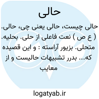 حالی. ( ع ص ) نعت فاعلی از حلی. بحلیه. متحلی. بزیور آراسته: و این قصیده که... بدرر تشبیهات حالیست و از معایب خالی. ( لباب الالباب ج 2ص 99 ). بعدل وافر سلطانی حالی گشت. ( جهانگشای جوینی ). جهان به ضیاء و روشنی حالی بود. ( جهانگشای جوینی ). || نعت فاعلی از حلوان و حلاوت. شیرین.