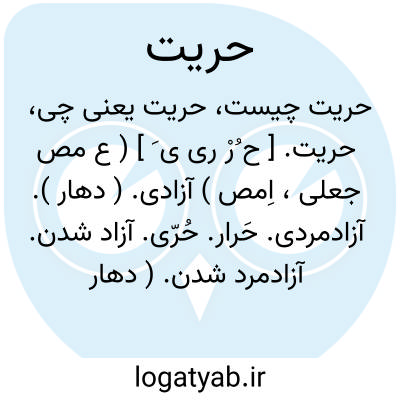 ( اسم ) آزادی آزادگی آزاد مردی آزاد منشی. توضیح ملکه ایست نفسانی که نگهبان نفس است بنحو حراست جوهری نه صناعی و کسی که قوای عقلی او قویتر باشد حریت او زیادتر است و بعکس کسی که قوای عقلی او کمتر باشد برد. شهوات و امیال نفسانی خود میشود. یا حریت خاصه. خروج از بردگی و مرادها و رسوم و آثاراست از جهت فنائ آنها در اراد. حق. حریت عامه. خروج از بردگی شهوات است.