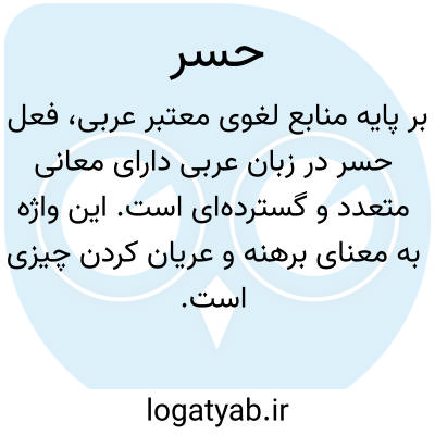 حسر. [ ح َ ]( ع مص ) برهنه کردن. ( منتهی الارب ). برهنه و آشکار کردن. برهنه کردن اندامی از اندامهای خویش. ( زوزنی ) ( تاج المصادر بیهقی ). برهنه کردن اندامی. ( مهذب الاسماء ). || رنجه کردن. ( ترجمان عادل بن علی ). رنجانیدن. ( تاج المصادر بیهقی ) ( مهذب الاسماء ). برنجانیدن. ( زوزنی ). || آرمان خوردن. ( تاج المصادر بیهقی ) ( مهذب الاسماء ). حسرت. دریغ خوردن. افسوس خوردن. || مانده کردن. || راندن شتر چنانکه مانده شود. ( منتهی الارب ). || کند شدن بینائی. کند شدن بصر. ( زوزنی ). || دور کردن. || جاروب کردن خانه. ( منتهی الارب ). || پوست از شاخ جدا کردن. || رنجه شدن حسود. || برافتادن مرغ. حسرت.