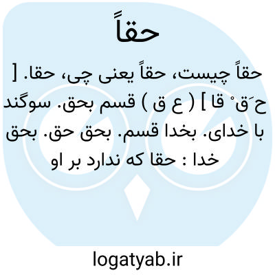 حقا. [ ح ِ ] ( اِخ ) حقاء. نام موضعی به نعمان از منازل هذیل. ( معجم البلدان ).، حق ا. [ ح َق ْ قُل ْ لاه ] ( ع اِ مرکب ) ( اصطلاح فقه ) امری که مخالفت آن اجراء حد یا تعزیرایجاب کند. مقابل حق الناس. رجوع به ماده حق شود.