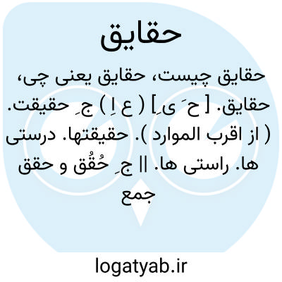( اسم ) جمع حقیقت. ۱ - حقیقتها. ۲ - ذاتیات واقعیات. یا حقایق ابداعی ( ابداعیه ). عقول مجرد و نفوس. یا حقایق ازلی ( ازلیه ). مثل افلاطونی ( آرائ اهل مدینه الفاضله قدمه ۱۱ ) یا حقایق اسمائ. اسمائ الهی. یا حقایق اشیائ. ذاتیات و فصول آنها.
