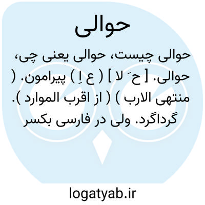 حوالی. [ ح َ لا ] ( ع اِ ) پیرامون. ( منتهی الارب ) ( از اقرب الموارد ). گرداگرد. ولی در فارسی بکسر لام متداول و معمول است. ( بهار عجم ) ( نشریه دانشکده ادبیات تبریز سال یکم شماره 3 ).