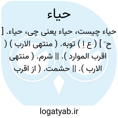 حیاء. [ ح َ ] ( ع اِ ) توبه. ( منتهی الارب ) ( اقرب الموارد ). || شرم. ( منتهی الارب ). || حشمت. ( از اقرب الموارد ). جرجانی گوید: گرفتگی نفس است از چیزی و ترک آن چیز از ترس سرزنش. ( اقرب الموارد ). و آن بردو نوع است نفسانی و ایمانی. و حیاء نفسانی شرمی است که خداوند آنرا در همه نفوس آورده است مانند شرم از کشف عورت و جماع بین مردم. و حیاء ایمانی شرمی است که مؤمن را از ارتکاب معاصی از ترس خدا بازمیدارد. ( تعریفات جرجانی ص 65 ). و رجوع به کشاف اصطلاحات الفنون شود. || فرج شتر ماده و رحم آن. ( منتهی الارب ). فرج اشتر. ( مهذب الاسماء ). || فرج گوسفند ماده و ددگان ماده و گاهی با الف مقصوره آید. ( منتهی الارب ). ج، احیاء و احییه و حی. || باران. ( آنندراج ) ( از اقرب الموارد ). رجوع به حیا شود. || ( مص ) زیستن. ( منتهی الارب ). رجوع به حیاة شود. || هویدا گردیدن راه. || شرم داشتن. ( منتهی الارب ) ( از اقرب الموارد ).