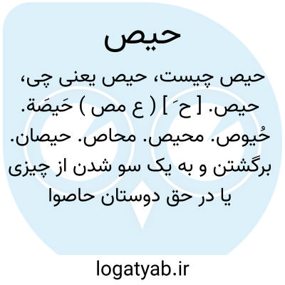 عدول. کنار شدن. «حاص عنه حیصاً عدل و حاد» علی هذا این کلمه معنی و وزناً مثل حید است که گذشت. محیص اسم مکان به معنی فرارگاه و محل کنار شدن است و آن در قرآن پنج بار آمده است برابر است بر ما خواه ناله کنیم یا صبور باشیم ما را فرارگاهی از عذاب نیست.
