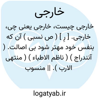 خارجی. [ رِ ] ( ص نسبی ) آن که بنفس خود مهتر شود بی اصالت. ( آنندراج ) ( ناظم الاطباء ) ( منتهی الارب ). || منسوب به خارج. ( فرهنگ نظام ) ( ناظم الاطباء ). بیرونی.( ناظم الاطباء ). بِرونی مقابل داخلی، بیگانه. مقابل اندرونی و درونی، غیر هم وطن. اجنبی. || مقابل ذهنی: وجود خارجی مقابل وجود ذهنی. وجود عینی. || منسوب است به بنوالخارجیه. ( آنندراج ) ( ناظم الاطباء ) ( منتهی الارب ). || وحشی. || استعمال خارجی، دارو و ضماد و مرهم تدهین و امثال آن بکار رود مقابل استعمال داخلی. || دینار خارجی. دینار بیرونی. || قضیه ای که حکم در آن فقط روی افراد خارجی میرود. ( کشاف اصطلاحات الفنون ج 1 ص 448 ). درکتب منطق بواسطه مطابقت صفت با موصوف بانتهای آن تاء اضافه می کنند و قضیه خارجیة می گویند: منه قول صاحب المنظومة: تسمی القضیة خارجیة و هی التی حکم فیها علی افراد موضوعها الموجودة فی الخارج محققة مثل: کل من فی العسکر قتل. ( شرح منظومه حاجی ملاهادی سبزواری چ ناصری ص 49 ). || آفاقی. || هر کس که معتقد مذهب خوارج باشد او را خارجی گویند و کیش او را خارجیه نامند و آنها فرقه بزرگی از فرق اسلامی هستند و بر هفت شعبه تقسیم میشوند. محکمیة - یهیشیه - ازراقیه - نجدات - اصفریه - اباضیه - عجاردة. ( کشاف اصطلاحات الفنون ج 1 ص 448 ). و از این جمله اند کسانی که بر علی علیه السلام خروج کردند. ( الانساب سمعانی ). || آنکه بر خلیفه یا امام وقت خروج کند. کافر خروج کننده بر دولت مسلم. ج، ( بسیاق فارسی ). خارجیان: آذرج [ بشام ] شهری است خرم وبا نعمت و در وی خارجیانند. ( حدود العالم ص 100 ).