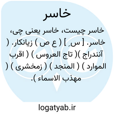 خاسر. [ س ِ ] ( ع ص ) زیانکار. ( آنندراج )( تاج العروس ) ( اقرب الموارد ) ( المنجد ) ( زمخشری ) ( مهذب الاسماء ). کسی که در مال او زیان واقع شود، کسی که نقصان خود کند. ( غیاث اللغة ). زیان دیده. زیان رسیده. متضرر. زیان زده. زیان کرده. بزیان، مقابل رابِح. ج، خاسران ( فارسی ). خاسرون، خاسرین. ( عربی ):