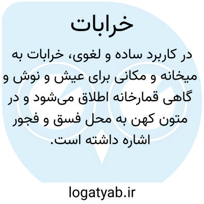 (خَ ) [ ع. ] (اِ. ) ۱ - جِ خرابه، ویرانه ها. ۲ - میخانه، میکده. ۳ - قمارخانه. ۴ - در عرفان، مقام و مرتبة ویرانی عادات نفسانی.