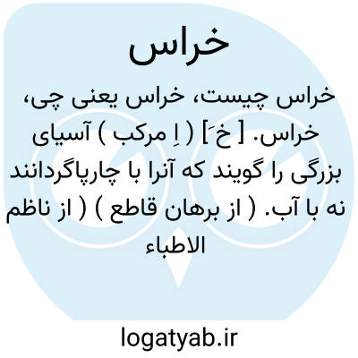 خراس. [ خ َ] ( اِ مرکب ) آسیای بزرگی را گویند که آنرا با چارپاگردانند نه با آب. ( از برهان قاطع ) ( از ناظم الاطباء ). آسیای بزرگ که به خر وستورش گردانند. ( از شرفنامه منیری ). آسیای بزرگ و اس که با خر گردانند. ( از آنندراج ). نوعی از آسیا که خر یا گاو می گرداند و جواز روغنگران که بدان از کنجد و غیره روغن گیرند. ( از غیاث اللغات ). خانه ای که در او بچهارپایان چیزی بسنگ آس کنند و آن سنگ را گروهی سنگ خراس گویند. ( یادداشت بخط مؤلف ):