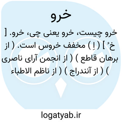 خرو. [ خ ُ ] ( اِ ) مخفف خروس است. ( از برهان قاطع ) ( از انجمن آرای ناصری ) ( از آنندراج ) ( از ناظم الاطباء ). خروه. خروچ. خروس. || خیرو. خبازی. ( ناظم الاطباء ). رجوع به خِرو شود.