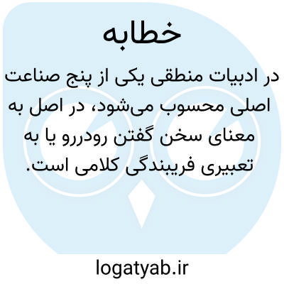 ۱ - ( مصدر ) خطبه خواندن وعظ کردن. ۲ - ( اسم ) سخنرانی خطیبی. ۳ - هر چه مفید اعتقاد غیر جازم بود و آن صناعتی است که با وجود وی ممکن باشد اقناع جمهور در آنچه که باید ایشانرا بدان تصدیق حاصل آید بقدر امکان. و گفته اند خطابت قوت است بر تکلف اقناع ممکن در هر یکی از امور مطروده به (( قوت ) ) ملک. نفسانی خواهند که یا بتلم قوانین حاصل شود یا بحصول تجربه از کثرت مزاولت افعال. یا فن خطابت. نزد قدمانیکی از بخشهای علوم منطقیه است.
