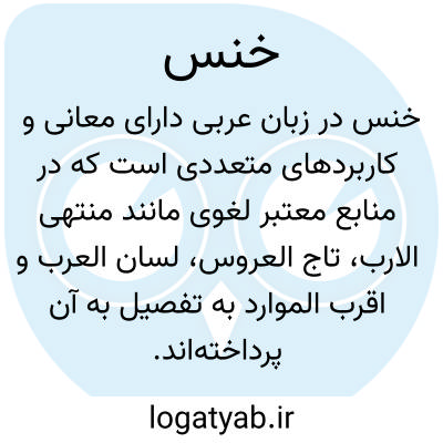 خنس. [ خ َ ] ( ع مص ) سپس ماندن. یقال: خنس عنه خنساً و خنوساً. || سپس کردن و گذشتن از آن. یقال: خنس زیداً. || گرفتن نر انگشت. یقال: خنس الابهام. || غایب کردن دیگری را.یقال: خنس بفلان. منه الحدیث: یخرج عنق من النار فتخنس بالجبارین فی النار؛ ای تدخلهم و تغیبهم فیها. || غایب گردیدن. پنهان شدن. ( منتهی الارب ) ( از تاج العروس ) ( از لسان العرب ) ( از اقرب الموارد ).