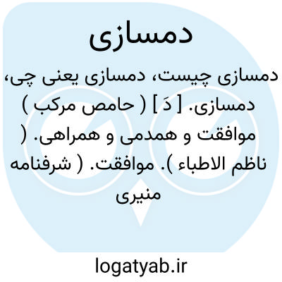 دمسازی. [ دَ ] ( حامص مرکب ) موافقت و همدمی و همراهی. ( ناظم الاطباء ). موافقت. ( شرفنامه منیری ). هم آهنگی. سازگاری. سازواری. ( یادداشت مؤلف ): توقع آن است که به وجه دمسازی و بنده نوازی قدم رنجه کنی. ( سندبادنامه ص 103 ).