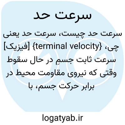 {terminal velocity} [فیزیک] سرعت ثابت جسمِ در حال سقوط وقتی که نیروی مقاومت محیط در برابر حرکت جسم، با وزن جسم که در جهت مخالف اثر می کند مساوی می شود