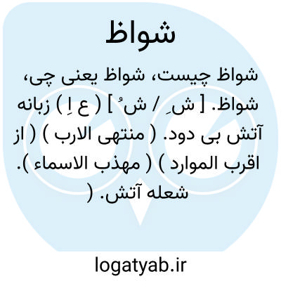 شواظ. [ ش ِ / ش ُ ] ( ع اِ ) زبانه آتش بی دود. ( منتهی الارب ) ( از اقرب الموارد ) ( مهذب الاسماء ). شعله آتش. ( غیاث ). مارج. لهب. زبانه. زبانه آتش. ( مهذب الاسماء ). || دود آتش. || حرارت آتش. ( منتهی الارب ) ( از اقرب الموارد ). || گرمی آفتاب. ( منتهی الارب ): اصابنی شواظ من الشمس. ( اقرب الموارد ). || شدت و تیزی شهوت جماع. ( منتهی الارب ) ( از اقرب الموارد ). || دشنام. ( منتهی الارب ). || بانگ و فریاد. ( منتهی الارب ) ( از اقرب الموارد ) ( ناظم الاطباء ). || حرارت صبح. || شدت عطش. ( ناظم الاطباء ). || ( مص ) مشاوظة. همدیگر را دشنام دادن. ( منتهی الارب ). مشاتمة. ( اقرب الموارد ).