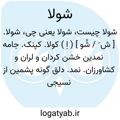 شولا. [ ش َ / شُو ] ( اِ ) کولا. کپنک. جامه نمدین خشن کردان و لران و کشاورزان. نمد. دلق گونه پشمین از نسیجی خشن فقرا را. جبه گونه از پشم که به زمستان روستائیان و کردان و درویشان درپوشند. ( یادداشت مؤلف ). خرقه. خرقه درویشان. ( ناظم الاطباء ) ( فرهنگ فارسی معین ).