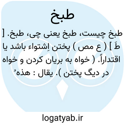(طَ ) [ ع. ] ۱ - (مص م. ) پختن. ۲ - (اِ. ) غذای پخته شده.