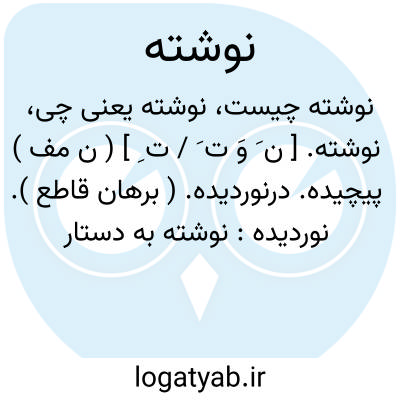 نوشته. [ ن ِ وِ ت َ / ت ِ ] ( ن مف ) کتابت کرده شده. ( غیاث اللغات ) ( برهان قاطع ). نوشته شده. که بر آن چیزی نگاشته یا نقشی کشیده باشند. مقابل نانوشته به معنی کاغذ سفید که بر آن چیزی ننوشته اند: