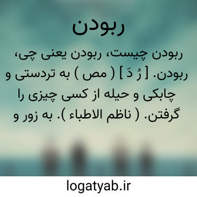 ( مصدر ) ( ربود رباید خواهد ربود بربا( ی ) رباینده ربوده ربایش ) ۱ - چیزی را با تردستی برداشتن و بردن در بردن. ۲ - دزدیدن تاراج کردن. ۳ - جذب کردن.