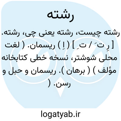 رشته. [ رِ ت َ / ت ِ ] ( اِ ) ریسمان. ( لغت محلی شوشتر، نسخه خطی کتابخانه مؤلف ) ( برهان ). ریسمان و حبل و رسن. ( ناظم الاطباء ). تار ابریشمی یا پنبه ای. ( از شعوری ج 2 ورق 20 ). از قبیل بافته ابریشمینه مانند رشته سر علم و گلوگاه نیزه و آنکه درویشان بر میان بندند و عیاران به بام افکنند. ( آنندراج ) ( انجمن آرا ). به معنی ریسمان است، و فربه و باریک و دراز و کوتاه و پُرتاب و هموار و غدار و پاره و صدپاره و بگسسته و گوهرکشیده از صفات، نبض از تشبیهات اوست. ( آنندراج ). رسن. ( غیاث اللغات ). ریسمان. شطن. ریسمانی که بر عده ای چیزهای شبیه به یکدیگر کشند، چون سبحه و امثال آن. ( یادداشت مؤلف ). در اصل صفت مفعولی،از «رشتن » ( بن ماضی + «َه » بیان حرکت ):