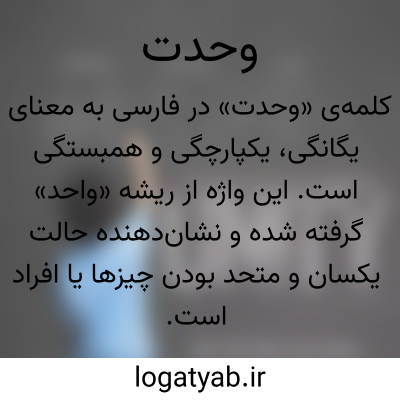 کلمه‌ی «وحدت» در فارسی به معنای یگانگی، یکپارچگی و همبستگی است. این واژه از ریشه «واحد» گرفته شده و نشان‌دهنده حالت یکسان و متحد بودن چیزها یا افراد است. «وحدت» می‌تواند در زمینه‌های اجتماعی، سیاسی، مذهبی و فرهنگی به کار رود. در اجتماع، وحدت به معنای همکاری، هماهنگی و همبستگی میان افراد یا گروه‌ها است. در مذهب و فلسفه، نشان‌دهنده یگانگی و کمال موجودات یا خداوند است. این مفهوم بار معنایی مثبت دارد و نشان‌دهنده انسجام، صلح و نظم است. وحدت می‌تواند موجب قدرت جمعی، ثبات و پیشرفت شود. در ادبیات فارسی، این واژه برای بیان پیوند قوی میان انسان‌ها و ارزش‌های اخلاقی استفاده می‌شود. این کلمه با واژه‌هایی مثل یگانگی، اتحاد، یکپارچگی و همدلی هم‌معنی است.