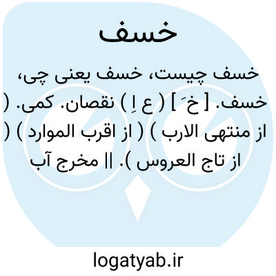 خسف. [ خ َ ] ( ع مص ) بسیارشیر گردیدن ماده شتر و در زمستان زود خشک شدن آن. ( از منتهی الارب ) ( از تاج العروس ) ( از اقرب الموارد ). منه: خسفت الناقه. || خسیف و پرشیر گردیدن ماده شتر و در سرما زود خشک شدن آن. ( از اقرب الموارد ) ( از منتهی الارب ). منه: خسف اﷲ الناقة. || برکندن چشم کسی. منه: خسف عین فلان. ( از منتهی الارب ) ( از اقرب الموارد ) ( از تاج العروس ) ( از لسان العرب ). || کنده و پاره شدن چشم کسی. ( از منتهی الارب ). || تمام شدن روشنایی ماه یا کم گردیدن آن. منه: خسف القمر. ( از منتهی الارب ) ( از اقرب الموارد ) ( از تاج العروس ). گرفتن ماه. ( یادداشت به خط مؤلف ). || تمام شدن روشنائی چشم کسی. منه: خسفت العین. ( از منتهی الارب ) ( از اقرب الموارد ). || کم گردیدن چیزی. منه: خسف الشی ٔ. ( از منتهی الارب ) ( از اقرب الموارد )( از تاج العروس ). || از پای درآمدن بر اثر بیماری. منه: خسف فلان. || لاغر شدن. ( از اقرب الموارد ) ( از منتهی الارب ) ( از تاج العروس ) ( از لسان العرب ). || پاره شدن چیزی و پاره کردن ( لازم و متعدی است ) منه: خسف الشی فخسف. ( از منتهی الارب ). || کندن چاه را در زمین سنگناک و جوش زدن آب و قطع نشدن آن. ( از منتهی الارب ) ( از تاج العروس ) ( از اقرب الموارد ). || فرورفتن در زمین. ( از منتهی الارب ) ( از اقرب الموارد ) ( از تاج العروس ). منه: خسف المکان. ( از منتهی الارب ) ( از تاج العروس ). || فروبردن بزمین. غایب کردن در زمین. ( از ترجمان علامه جرجانی ) ( از منتهی الارب ) ( از تاج العروس ) ( از اقرب الموارد ): فخسفنا به وبداره الارض فما کان له مِن ْ فئة ( قرآن 81/28 ) و منهم من خسفنا به الارض و منهم من اَغْرقنا ( قرآن 40/29 ). لولا ان مَن َّ اﷲ علینا لخسف بنا. ( قرآن 82/28 ).