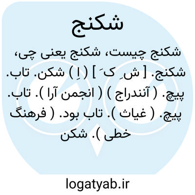 شکنج. [ ش ِ ک َ ] ( اِ ) شکن. تاب. پیچ. ( آنندراج ) ( انجمن آرا ). تاب. پیچ. ( غیاث ). تاب بود. ( فرهنگ خطی ). شکن باشد. ( فرهنگ اوبهی ). مطلق چین. شکن. پیچ. تاب. کلچ. ماز. ( یادداشت مؤلف ):