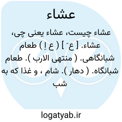 عشاء. [ ع َ ] ( ع اِ ) طعام شبانگاهی. ( منتهی الارب ). طعام شبانگاه. ( دهار ). شام، و غذا که به شب خورند. ( یادداشت مؤلف ). طعام شب، در مقابل غداء. ( از اقرب الموارد ). ج، أعشیة. ( منتهی الارب ) ( اقرب الموارد ).