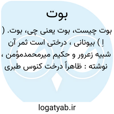 بوت. ( اِ ) بیونانی، درختی است ثمر آن شبیه زعرور و حکیم میرمحمدمؤمن، نوشته: ظاهراً درخت کنوس طبری، همین باشد. ( فهرست مخزن الادویه ) ( تحفه حکیم مؤمن ). درختی است نبات آن بنبات زعرور ماند. ( آنندراج ) ( ناظم الاطباء ).