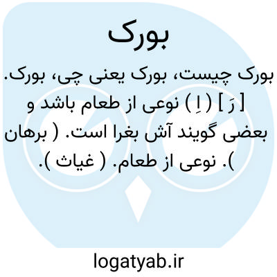 بورک. [ رَ ] ( اِ ) نوعی از طعام باشد و بعضی گویند آش بغرا است. ( برهان ). نوعی از طعام. ( غیاث ). نوعی از آش ماست. ( رشیدی ).نوعی از طعام و گویند آش ماست است. ( انجمن آرا ) ( آنندراج )....گویا بغرا بمرور زمان بورک شده است. ( از اصطلاحات و لغات دیوان ابواسحاق اطعمه ):