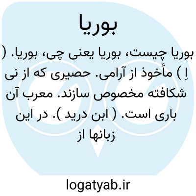 بوریا. ( اِ ) مأخوذ از آرامی. حصیری که از نی شکافته مخصوص سازند. معرب آن باری است. ( ابن درید ). در این زبانها از سومری بعاریت گرفته شده. ( حاشیه برهان چ معین ). معروف است، حصیری که در خانه اندازند. ( انجمن آرا ). حصیری است که در خانه اندازند و باریا معرب آن است. ( از آنندراج ). حصیری که از نیهای شکافته سازند. ( ناظم الاطباء ): و از وی [ شهر ترمذ ] صابون و بوریای سبز و بادبیزن خیزد. ( حدود العالم ). اندرین روز اطلاق کردند بهای بوریا و نفت که جسد جعفر یحیی برمکی را سوخته آید. ( تاریخ بیهقی چ ادیب ص 191 ).
