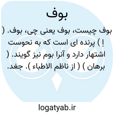 بوف. ( اِ ) پرنده ای است که به نحوست اشتهار دارد و آنرا بوم نیز گویند. ( برهان ) ( از ناظم الاطباء ). جغد. ( فرهنگ فارسی معین ). مرغی است بنحوست معروف و آنرا کوف و بوم نیز گویند و به جغد مشهور است و بیشتر در ویرانه ها آشیانه کند. ( آنندراج ) ( جهانگیری ) ( انجمن آرا ). بمعنی بوم، ظاهراًمصحف کوف است. ( رشیدی ). در ادبیات زرتشتی نام جغد «بهمن مرغ » آمده. در «صددر» در 14 آمده: «اورمزد به افزونی مرغی بیافریده است که او را «آشوزشت » خوانند و «بهمن مرغ » نیز خوانند. «کوف » نیز گویند و کوف همان بوف است. تغییر کاف یا گاف به یاء نظایر دارد مانند گوشاسب و بوشاسف. ( حاشیه برهان چ معین ):