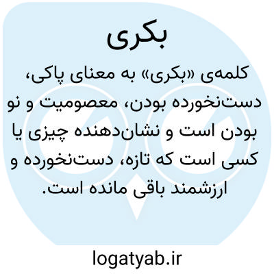 کلمهی «بکری» در زبان فارسی به معنای دختری که هنوز ازدواج نکرده و عفت و پاکی خود را حفظ کرده است، یا به طور کلی جوان و دستنخورده است. این واژه از ریشه «بکر» در عربی گرفته شده و بار معنایی آن به پاکی، دستنخورده بودن و معصومیت اشاره دارد. در کاربردهای ادبی و فرهنگی، «بکری» ممکن است به فرد یا چیزی اشاره داشته باشد که تازه، نو و دستنخورده است و هنوز تأثیر یا تغییرات بیرونی بر آن وارد نشده است. در متون کهن فارسی، شعرها و داستانها، این واژه برای توصیف زنان جوان و پاکدامن استفاده شده و نشانهای از ارزش و احترام به عفت و پاکی است. همچنین در زبان محاورهای، «بکری» گاهی به معنای تجربهنشده و ناپخته به کار میرود، مانند زمین بکر یا فرصت بکر. هممعنیهای این واژه شامل پاکی، دستنخورده بودن ، معصومیت و نو بودن است. کاربرد این واژه بیشتر در ادبیات، فرهنگ و گاهی مکالمات روزمره برای اشاره به جوانی، تازه بودن یا پاکی دیده میشود. این کلمه بار مثبت دارد و معمولاً برای تمجید یا توصیف ارزشهای اخلاقی و طبیعی استفاده میشود.