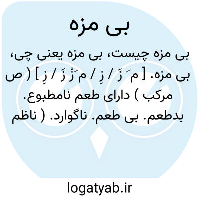 بی مزه. [ م َ زَ / زِ / م َزْ زَ / زِ ] ( ص مرکب ) دارای طعم نامطبوع. بدطعم. بی طعم. ناگوارد. ( ناظم الاطباء ). نامطبوع. ( یادداشت مؤلف ). کریه. ناخوش آیند. نفرت آور. بی طعم: