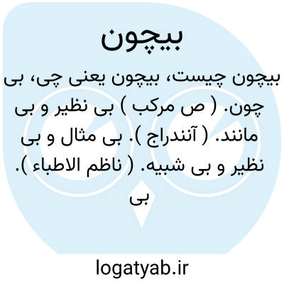 بی چون. ( ص مرکب ) بی نظیر و بی مانند. ( آنندراج ). بی مثال و بی نظیر و بی شبیه. ( ناظم الاطباء ). بی مانند و بی نظیر. ( فرهنگ فارسی معین ).، بیچون. ( اِخ ) نامی از نام های حق سبحانه و تعالی. ( آنندراج ). خدای تعالی. ( فرهنگ فارسی معین ). آنکه از وی تفسیر نتوان کرد و نعتش نتوان نمود. ( ناظم الاطباء ): حضرت بیچون. قادر بی چون؛ خدای تبارک و تعالی. خدای تعالی. نامی از نامهای خدای تعالی: