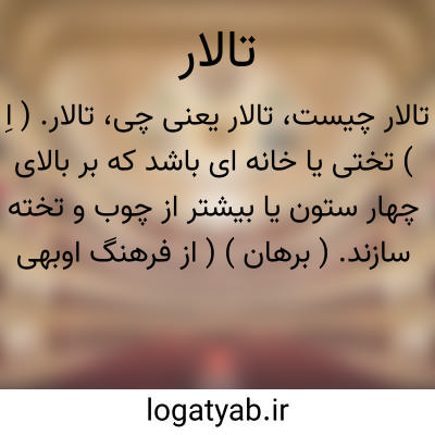 تالار. ( اِ ) تختی یا خانه ای باشد که بر بالای چهار ستون یا بیشتر از چوب و تخته سازند. ( برهان ) ( از فرهنگ اوبهی ). عمارتی بود که چهار ستون بر چهار طرف صفه بر زمین فروبرند و بالای آن را بچوب و تخته بپوشند. ( فرهنگ جهانگیری ) ( فرهنگ رشیدی ). تخت یا خانه ای که بر بالای چند ستون سازند. ( ناظم الاطباء ). اطاق چوبی که بر بالای چهار ستون چوبی ساخته میشود به این طور که چهار ستون بزرگ در زمین فروکنند و وسط آن ستونها تخته ها کوبیده فرش اطاق قرار دهند و بالای ستونها را با تخته پوشیده سقف اطاق سازند. چنین اطاق در شهرهای مرطوب ایران مثل تبرستان و گیلان برای خواب شب تابستان استعمال میشود که هم بادگیر است و هم جانوران درنده را به آن راه نیست اما در تبرستان آن را اکنون نفار گویند. ( فرهنگ نظام ). در تبرستان آن را «ناپار» و«نپار» گویند. ( از آنندراج ) ( انجمن آرا ). رجوع به انجمن آرا و آنندراج شود. محمّد معین در حاشیه برهان قاطع آرد: کردی «تالار»، گیلکی «تَلَر»: