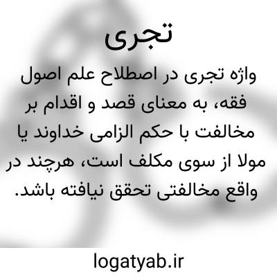 [ویکی فقه] ــ تجرّی مخالفت عملی با حکم الزامی مولا به زعم شخص متجری است؛ بدون آنکه در واقع مخالفتی صورت گرفته باشد، مانند کسی که آب را به گمان شراب بودن بنوشد، سپس معلوم گردد که آن مایع، آب بوده است نه شراب. در اینکه تجرّی حرام است یا نه اختلاف است همچنین تجرّی موجب فسق است.در اصول فقه مباحث زیادی دربارۀ عنوان تجری مطرح شده و این مسئله مورد اختلاف است، از جمله اینکه آیا تجرّی فعل قلبی است یا خارجی؟ و اینکه آیا قبح عقلی تجرّی مستلزم حرمت شرعی و استحقاق عقاب است یا نه؟ ــ تجری به مخالفت با تکلیف مقطوع، در فرض خطا بودن اعتقاد اطلاق می شود.