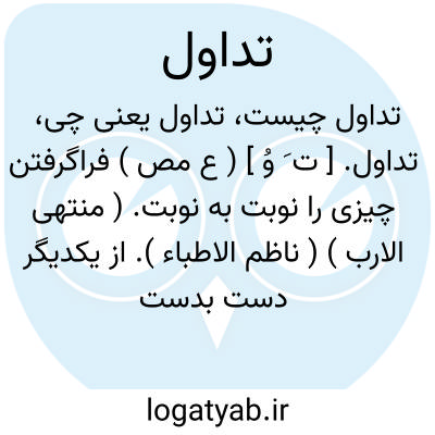 تداول. [ ت َ وُ ] ( ع مص ) فراگرفتن چیزی را نوبت به نوبت. ( منتهی الارب ) ( ناظم الاطباء ). از یکدیگر دست بدست فراگرفتن. ( غیاث اللغات ) ( آنندراج ). || از یکدیگر فراگرفتن نیزه در حرب. ( منتهی الارب ) ( از ناظم الاطباء ). || بنوبت گرفتن چیزی را. ( منتهی الارب ) ( ناظم الاطباء ) ( از غیاث اللغات ) ( از آنندراج ). تداولته الایدی؛ تعاقبته؛ ای اخذته هذه مرةً و هذه مرةً و منه قولهم: تداولوا الشی َٔ بینهم؛ ای تناقلوه و قلبوه بین ایدیهم و تناوبوه. ( المنجد ) ( از اقرب الموارد ). || دست بدست گشتن. از زبانی به زبانی رفتن. رواج یافتن کلمه یا کلامی در زبانی.