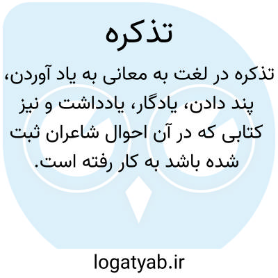 ۱- ( اسم ) یاد آوری. ۲- ( اسم ) آنچه موجب یاد آوری شود وسیل. تذکر یادگار. ۳- یاد داشت. ۴- مجموعه و کتابی که در آن ترجم. احوال شاعران و نویسندگان را گرد آورند. ۵ - گذر نامه پاسپورت. جمع: تذاکر.