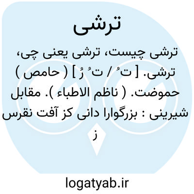 ۱- کیفیت چیز ترش حموضت.۲- ( اسم ) کلی. مواد غذایی که مز. ترش دارند و مقداری از اسید های مختلف در ترکیبشان وجود دارد. ترشیها را بعنوان چاشنی غذا بکار میبرند. ۳- اسید. جمع: ترشیها. ترشیجات.