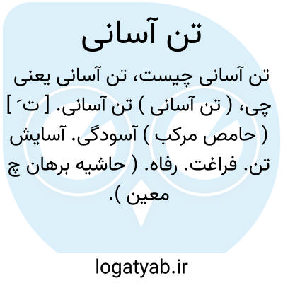 ( تن آسانی ) تن آسانی. [ ت َ ] ( حامص مرکب ) آسودگی. آسایش تن. فراغت. رفاه. ( حاشیه برهان چ معین ). تناسانی و تناسائی، نوازش و آسایش بدنی. ( ناظم الاطباء ). راحت و آرام. ( غیاث اللغات ):