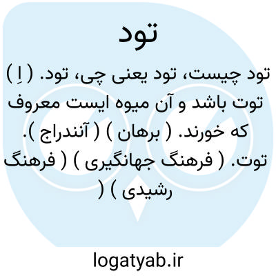 تود. ( اِ ) توت باشد و آن میوه ایست معروف که خورند. ( برهان ) ( آنندراج ). توت. ( فرهنگ جهانگیری ) ( فرهنگ رشیدی ) ( یادداشت بخطمرحوم دهخدا ). فرصاد. ( یادداشت ایضاً ):