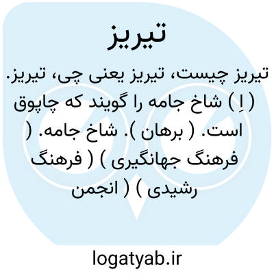 تیریز. ( اِ ) شاخ جامه را گویند که چاپوق است. ( برهان ). شاخ جامه. ( فرهنگ جهانگیری ) ( فرهنگ رشیدی ) ( انجمن آرا ) ( آنندراج ). چابوق و شاخ جامه. ( ناظم الاطباء )... و شاخ جامه را در عرف این زمان چاپوق گویند. ( انجمن آرا ) ( آنندراج ). تریز. ( فرهنگ رشیدی ). معرب آن تخریص است. ( انجمن آرا ). یک قطعه جامه که آن را تریز نیز گویند وبه تازیش دِخریص خوانند. ( از شرفنامه منیری ). تیریج. تخریص. دخریص. تریج. ( یادداشت بخط مرحوم دهخدا ). معرب تیریز تخریص و دخریص است و عرب آن را بِنَقَة گوید و نیز بَنیقَة. ( قاموس از یادداشت ایضاً ). و امروز تریج گویند. ( یادداشت ایضاً ): تخریص؛ خشتک پیراهن و جز آن معرب تیریز است. ( منتهی الارب ):