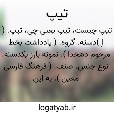 تیپ. ( اِ )دسته. گروه. ( یادداشت بخط مرحوم دهخدا ). نمونه بارز یکدسته. نوع جنس. صنف. ( فرهنگ فارسی معین ). به این معنی ظاهراً از کلمه تیپ فرانسه مأخوذ است: جماعت افغان که قزلباشیه را مستعد حرب دیدند لشکر خود را سه تیپ کرده یک دسته در میان و دو دسته از دو طرف... ( مجمل التواریخ گلستانه از یادداشت بخط مرحوم دهخدا ). || لشکری که مرکب از دو فوج یا بیشتر است و صاحب منصب آن سرتیپ گفته میشود. ( فرهنگ نظام ). واحدی در نظام که در تشکیلات کنونی شامل چند هنگ ( فوج ) است و هر لشکر شامل چند تیپ. ( فرهنگ فارسی معین ). || متصل به یکدیگر. بی درز. ( یادداشت بخط مرحوم دهخدا ).
